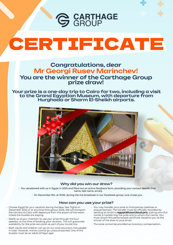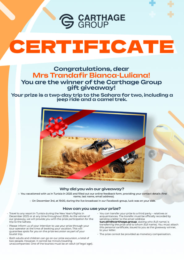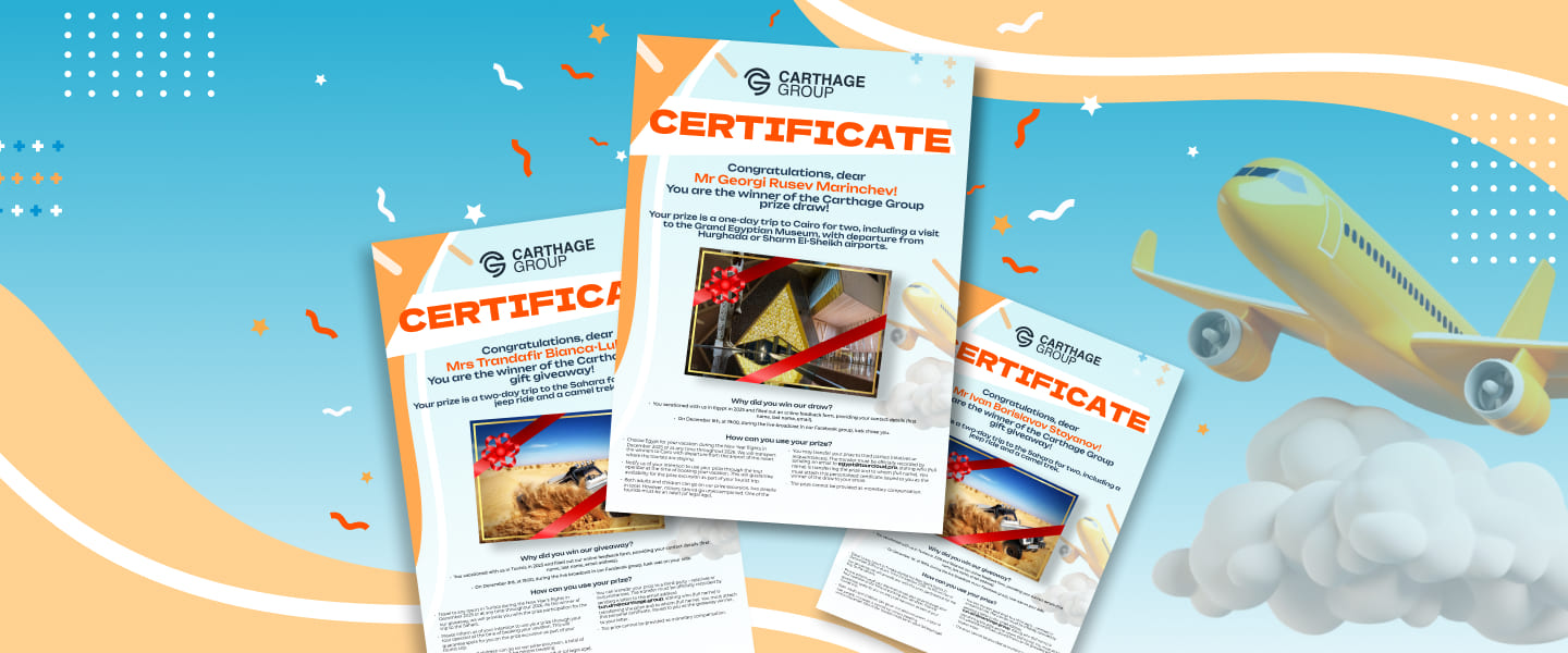 Information about the specific prizes won by the winners is in the gift certificates published just below. We will only add that the prize can be transferred to third parties. This means that the winners’ family, friends and acquaintances, anyone they would like to make happy this upcoming Christmas and New Year, can become participants in the exciting adventures in Tunisia and Egypt from Carthage Group.